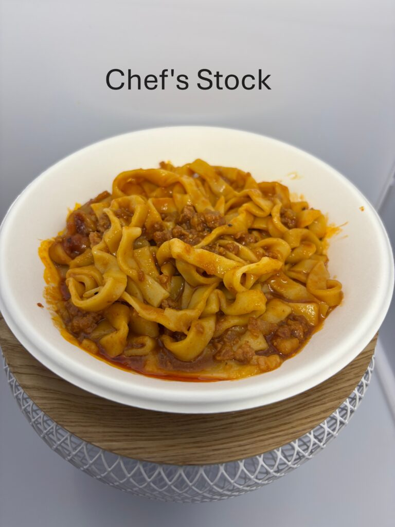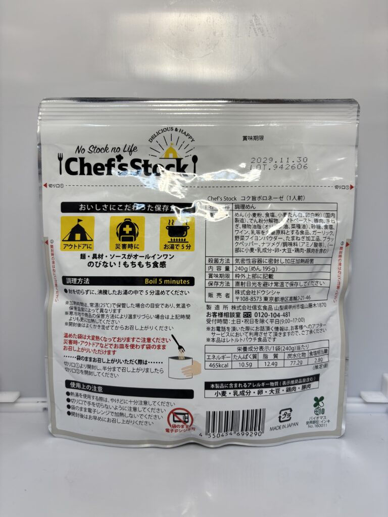 Chef’s Stock コク旨ボロネーゼ は株式会社信玄食品が製造、株式会社ドウシシャが販売する長期保存調理めんです。