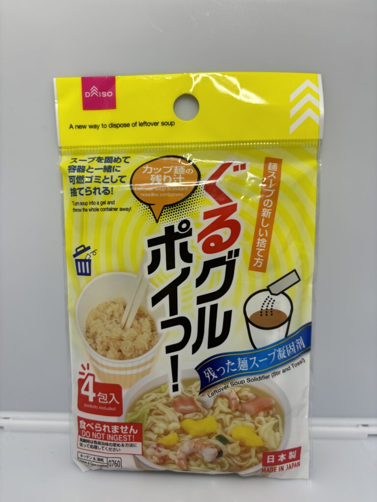 まあ残った場合は凝固剤で固めるのも手です。ダイソーのぐるグルポイっ!(残った麺スープ凝固剤)を混ぜるときちんと固まりました。