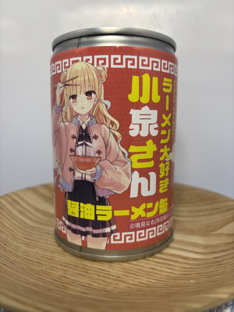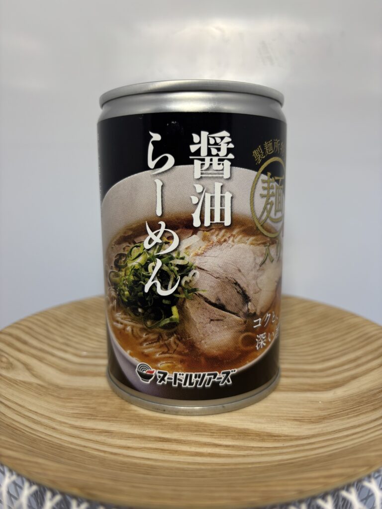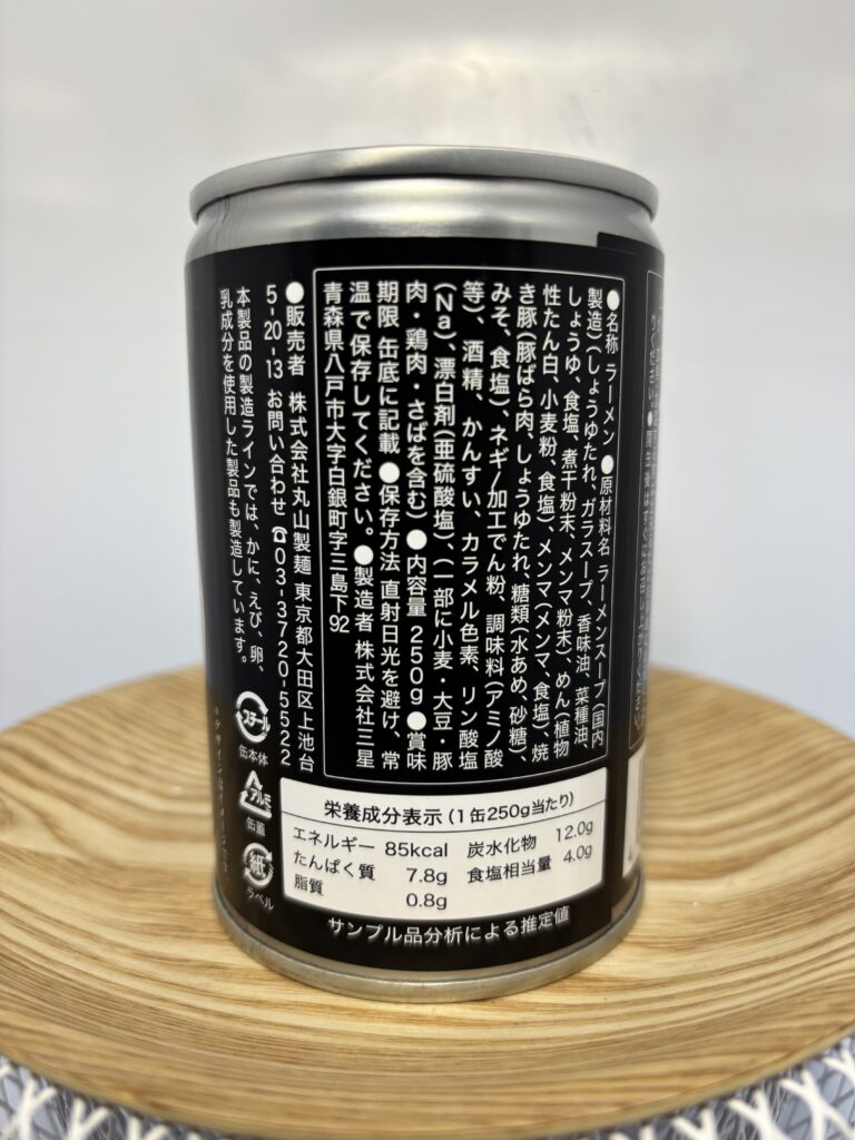 らーめん缶 醬油ラーメン は株式会社三星が製造、株式会社丸山製麺が販売する長期保存ラーメンの缶詰です。