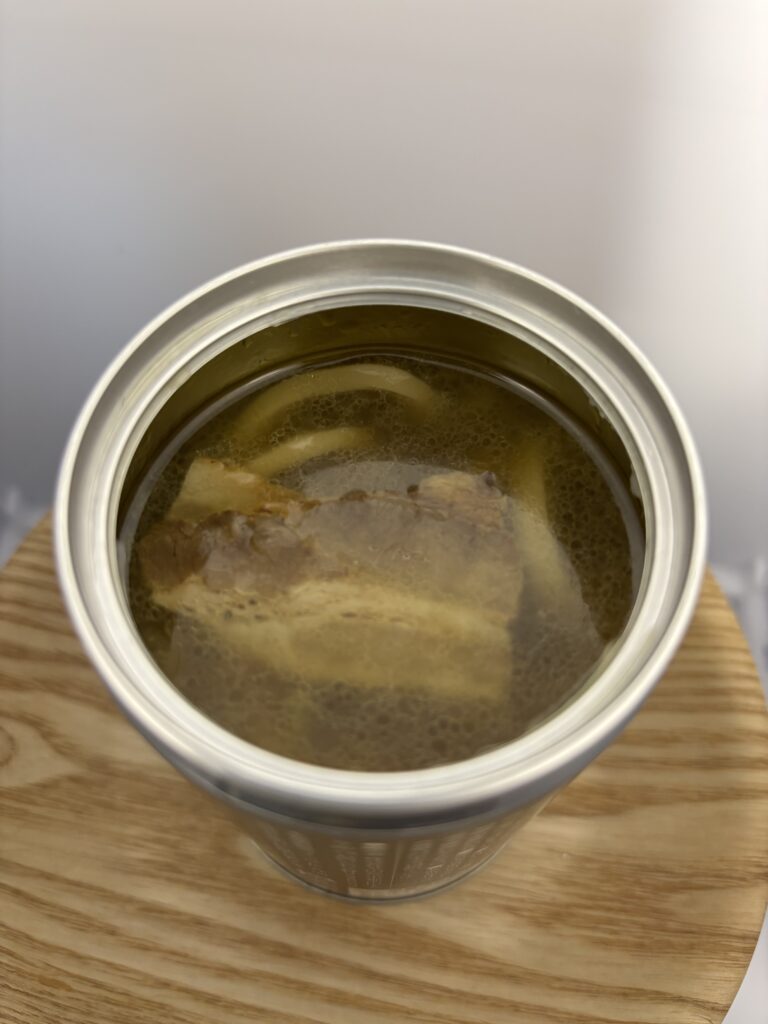 お味は…麺・焼豚・メンマ・ねぎの各具材の味は加熱と変わらずおいしく食べられます。特に麺の食感が変わらずいい具合のぷるぷる感をキープしているのは驚きです。スープが冷たい状態でも固形の油が散乱していないのも良きですが、加熱時よりスープに油が馴染まず表面に浮いてくるので麺をすくう際にまとわりついてスープの味が麺に絡みにくいのは少し残念なところ。とはいえラーメンで温かいものと常温でこれだけ差が少ないのはすごいことなのでは、と思います。