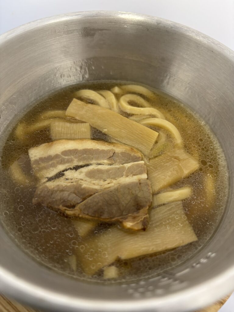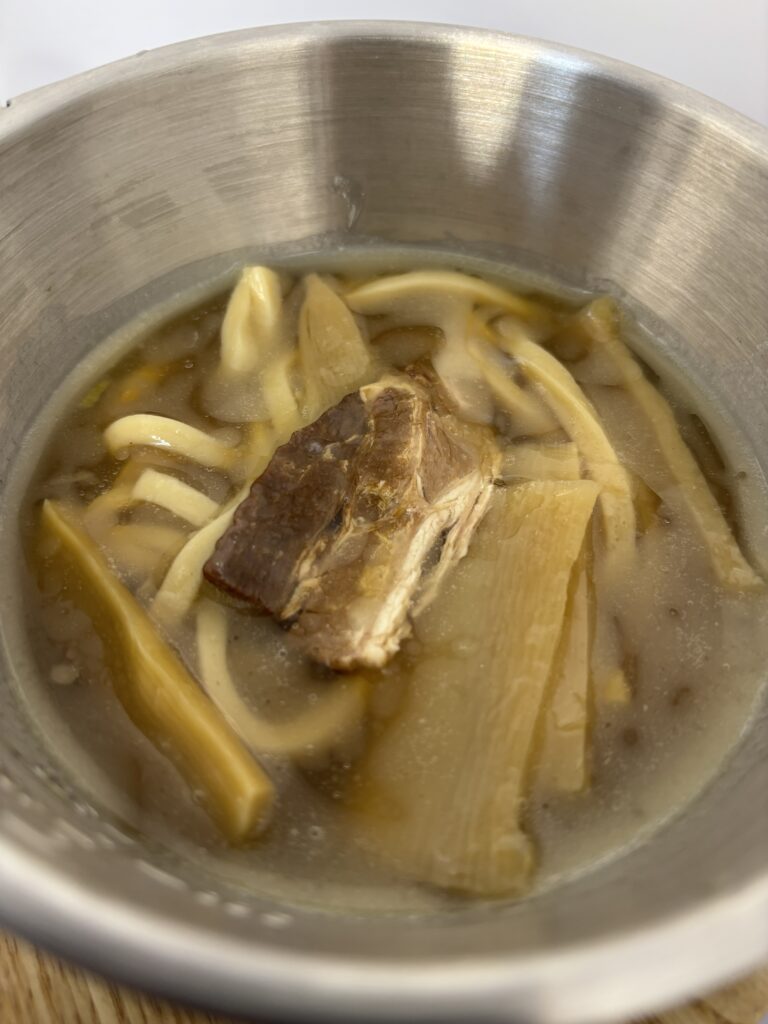 鶏がらベースのあっさり、しかししょっぱさが染みる醤油スープです。麺は縦横5mmくらいの太麺で柔らかく何だかぷるぷるした不思議な食感がします(粘り・弾力の方向性が異なるのでうどんに似ているわけでもない)。具は焼豚・メンマ・ねぎの3種類。焼豚は肉と油身が半々、スーパーで売っているハーフベーコンを半分に切ったくらいの量と少し寂しいものの、お肉の味はしっかり感じられます。対してメンマは4~5本とそこそこ入っていて嬉しい限り。柔らかめながらもコリコリとした心地よい歯ごたえは健在です。ねぎは…ほとんどばらけたり溶けたりして存在感はあまりないけど、たまに出会えると嬉しいよ。