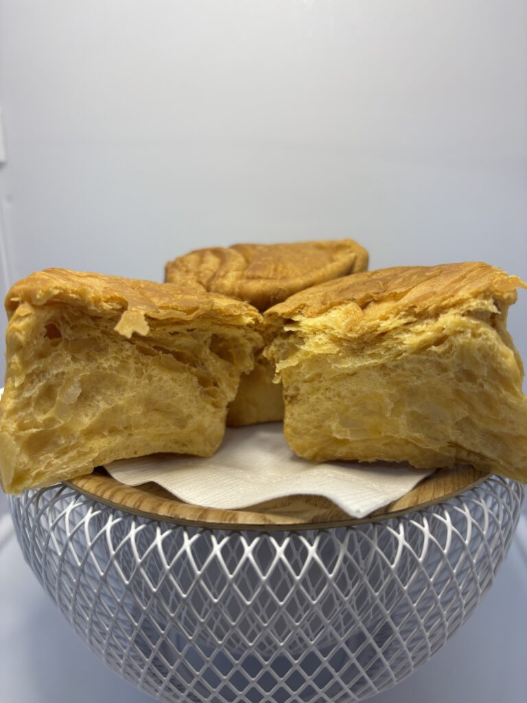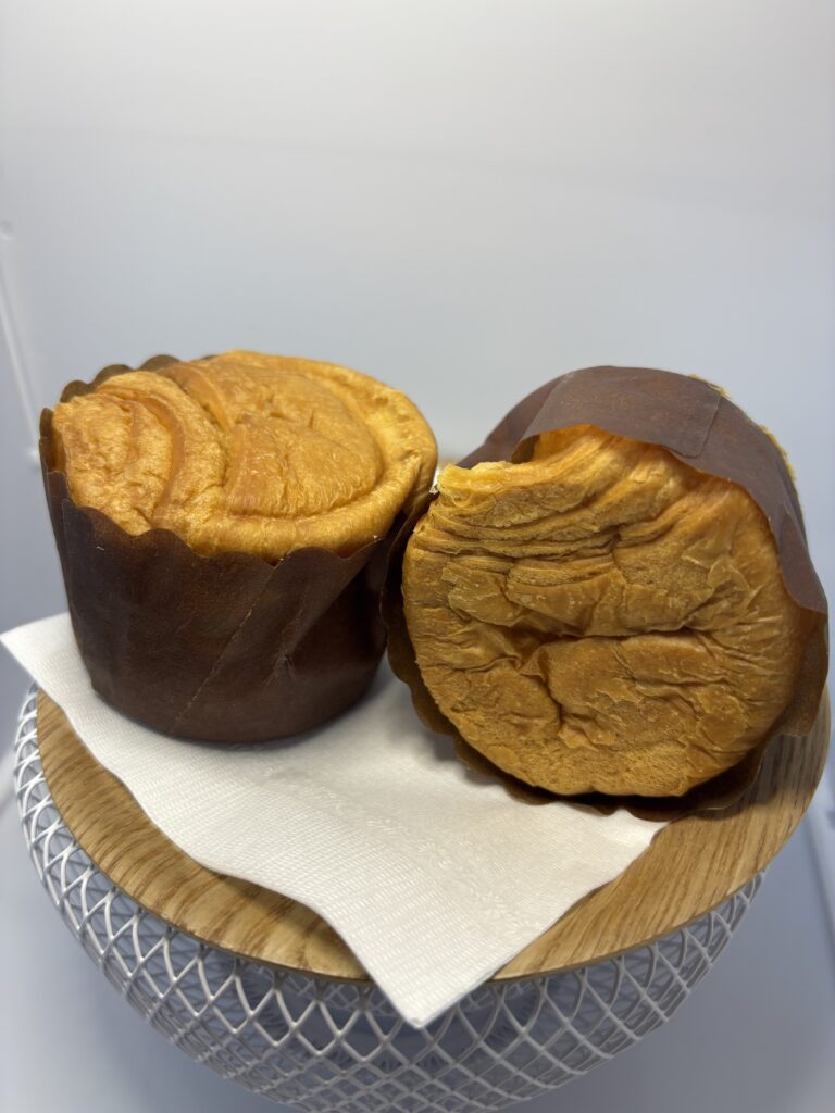 均一に貼りついていた脂っこさがうまく溶け込んで全体のゴワつきが解消され、外は香ばしくさっくり中は柔らかくなったデニッシュ層と空気層がマッチして優しい口当たりを生みそのままよりも食べやすくおいしくなりました。
